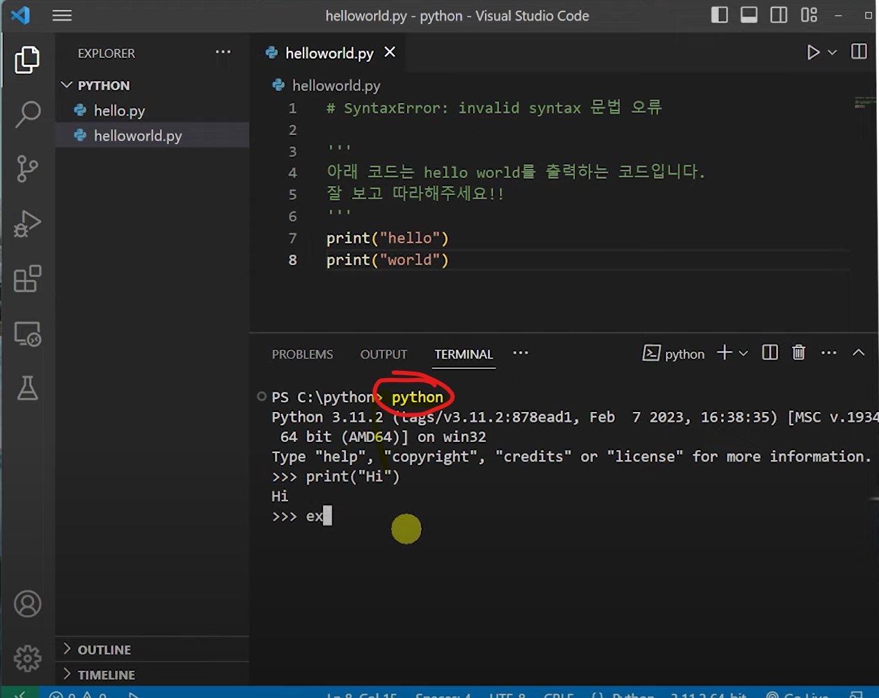 PS C:\python> 뒤에 python hellopython.py 를 입력해야 함.(python 뒤에 띄어쓰기 중요)